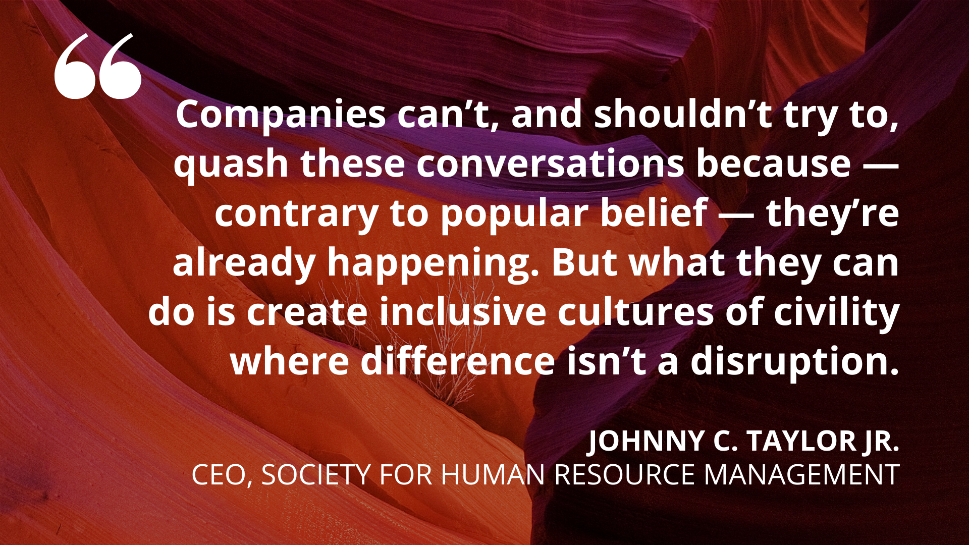 Companies can't, and shouldn't try to, quash these conversations because - contrary to popular belief - they're already happening. But what they can do is create inclusive cultures of civility where difference isn't a disruption - Johnny C. Taylor Jr, CEO, Society for Human Resource Management